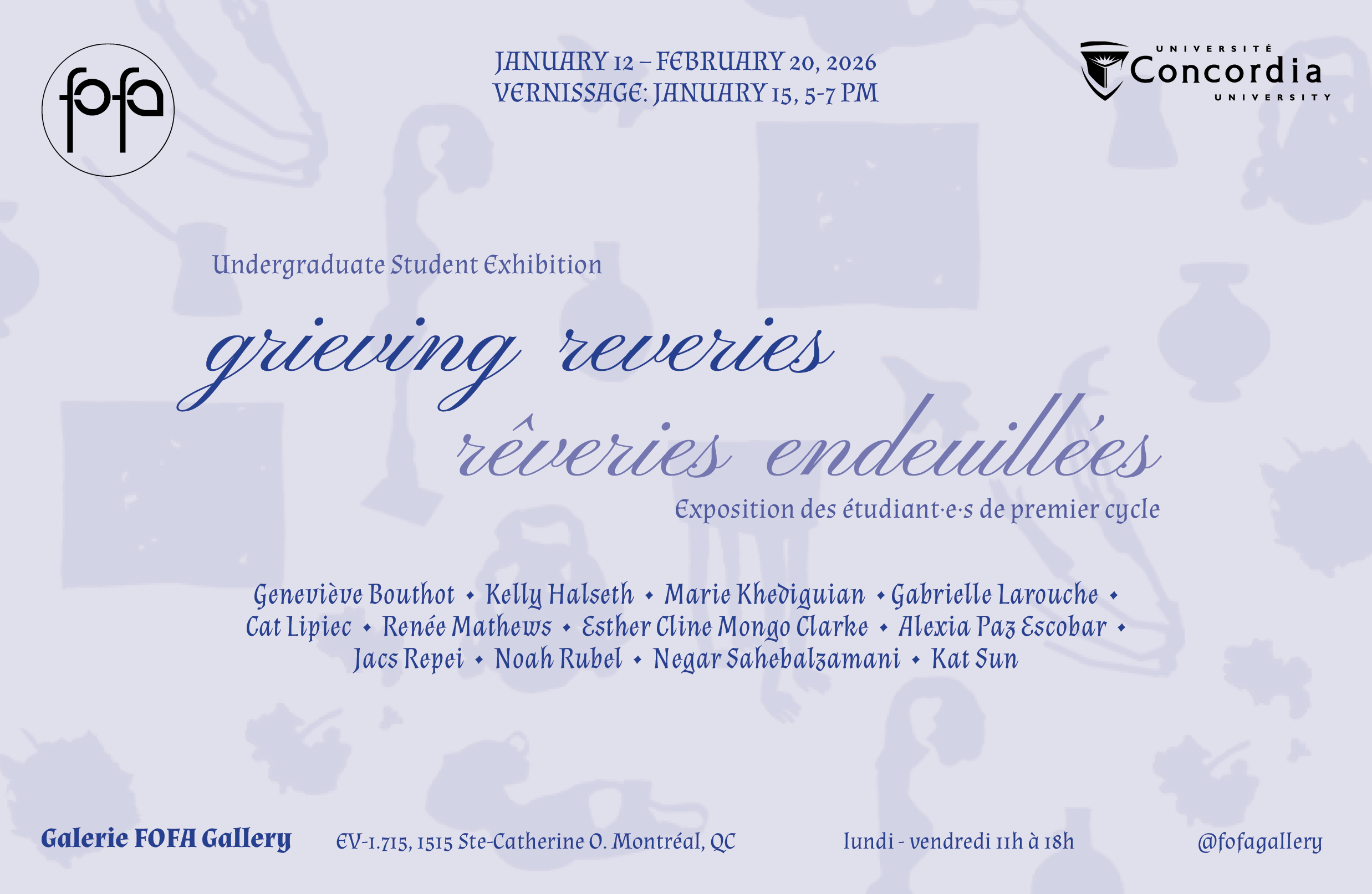 Marie Khediguian participated in the 2026 FOFA Undergraduate Student Exhibition, grieving reveries, an interdepartmental exhibition highlighting selected undergraduate artists across Concordia’s Faculty of Fine Arts.